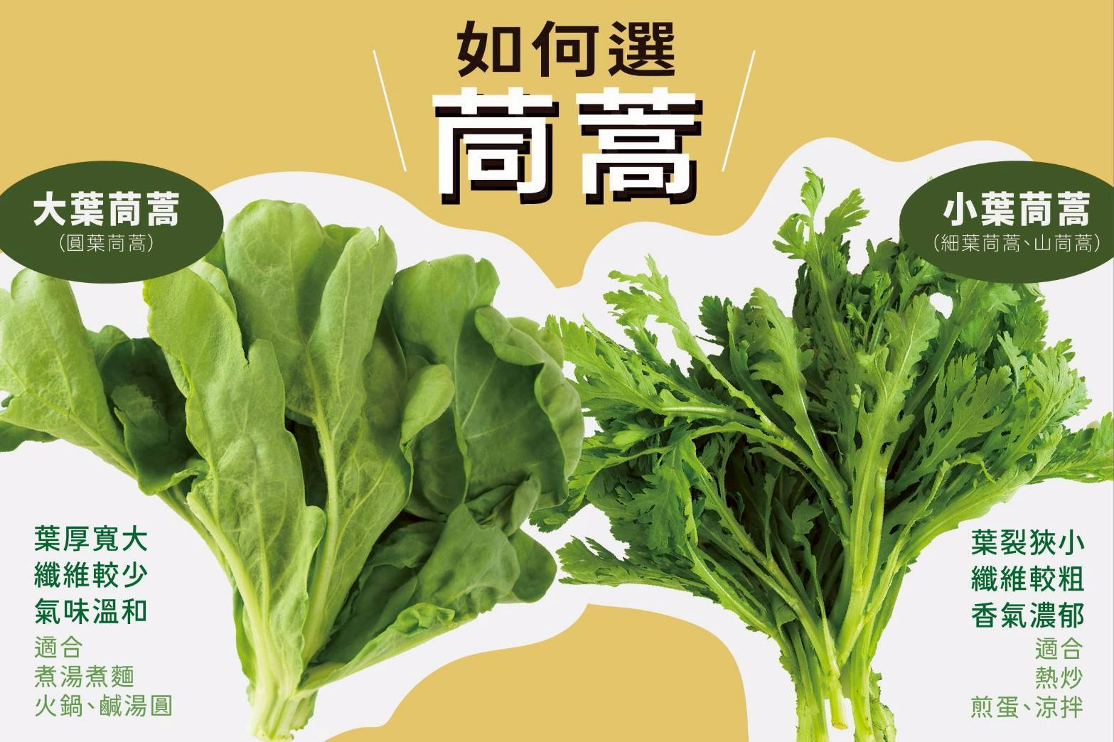 大葉茼蒿葉片圓滑飽滿,口感軟嫩,適合燙火鍋或煮湯圓 ;山茼蒿(春菊)葉子細長,香氣強烈且口感清脆,適合熱炒 。 - 茼蒿為什麼被稱為「消火藥」?