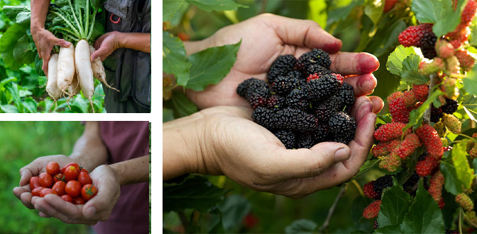 除了符合里山精神的有機耕作,我們更積極與林業及自然保育署、紫斑蝶協會等政府部會/民間團體共同支持綠色保育的水雉/紫斑蝶復育、鼓勵檳榔廢園後的油樹轉作、推廣淨化水庫上游水源的淨源茶等保育專案。為了鼓勵農友一起來養護大地,在推廣期以高於市價的契約種植來保價收購,也串連食品廠以加工方式為產量不定、長相大小不一的蔬果加值,就是要努力營造棲地生態、為田間動物留生機。