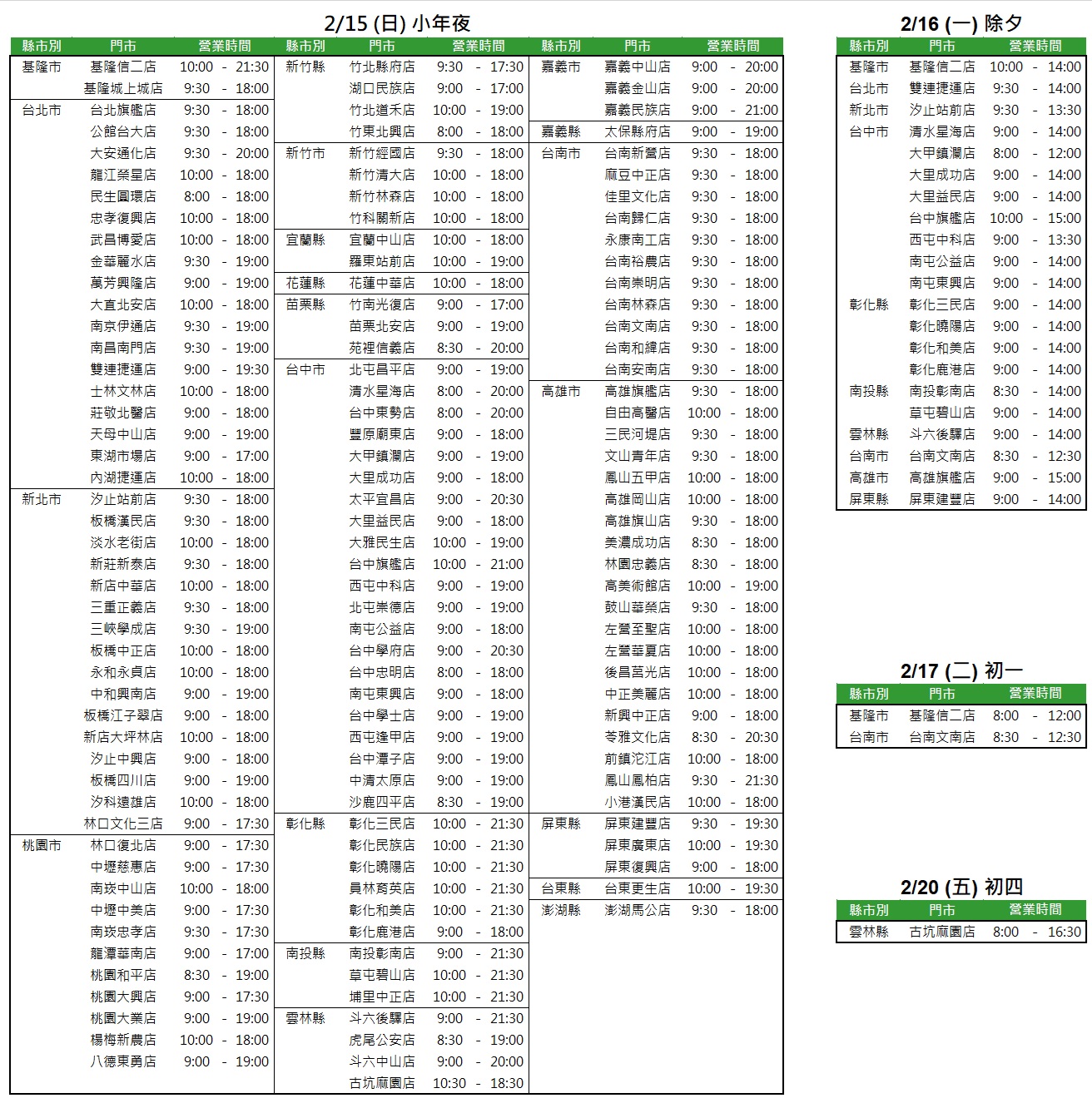 ● 門市營業時間如有調整,請以各店實際公告為主。