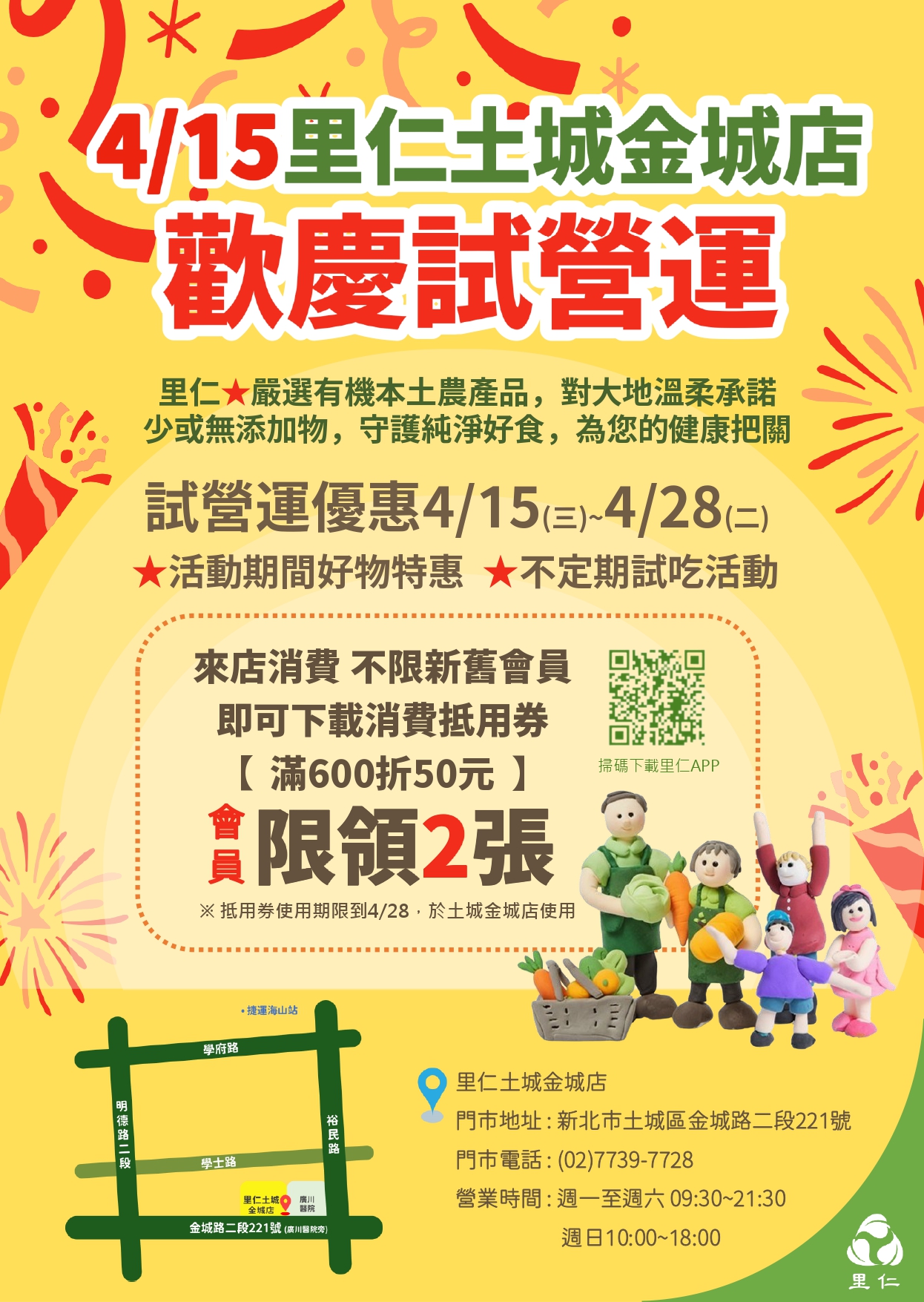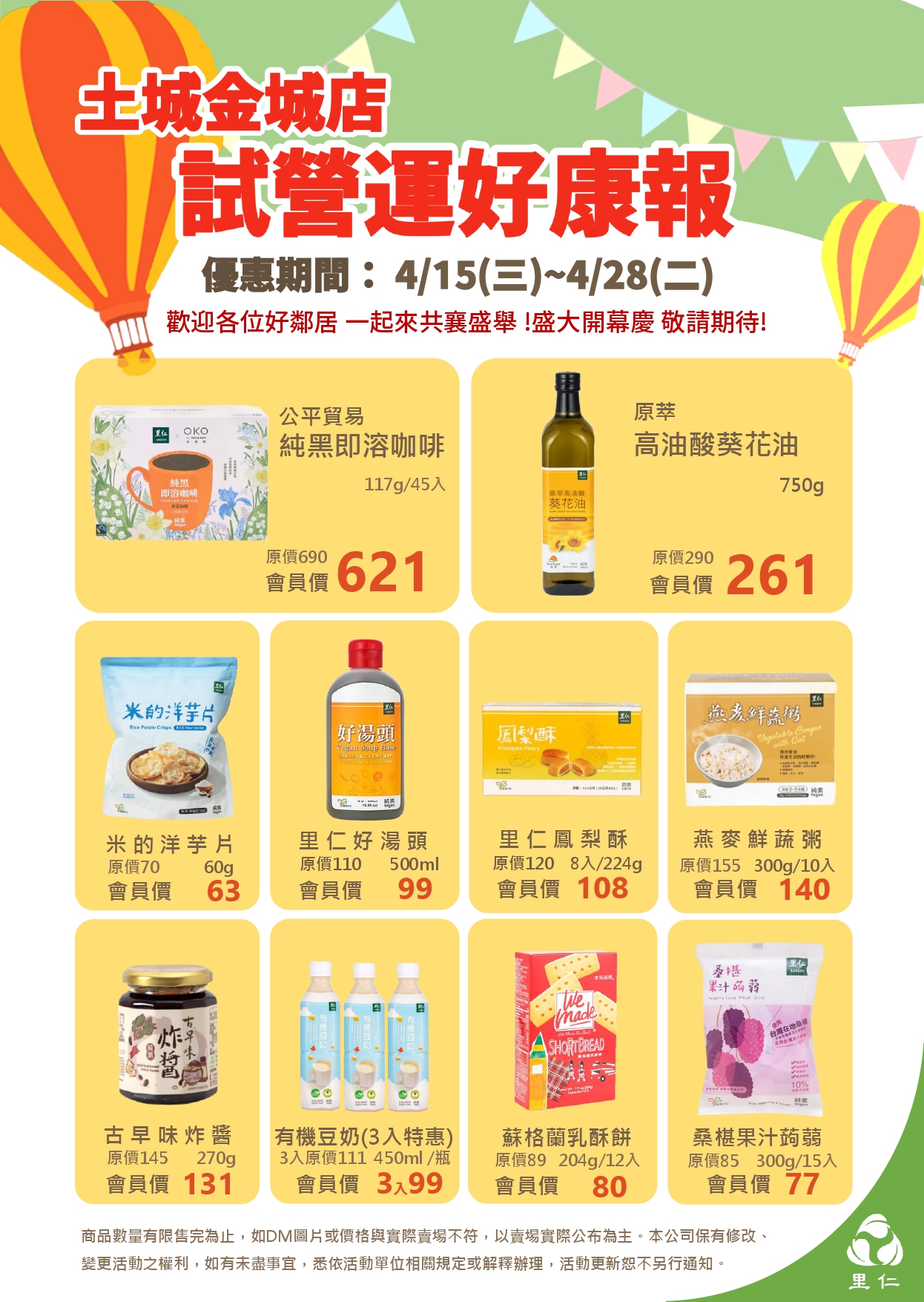 里仁土城金城店將於4月15日至4月28日舉行試賣活動