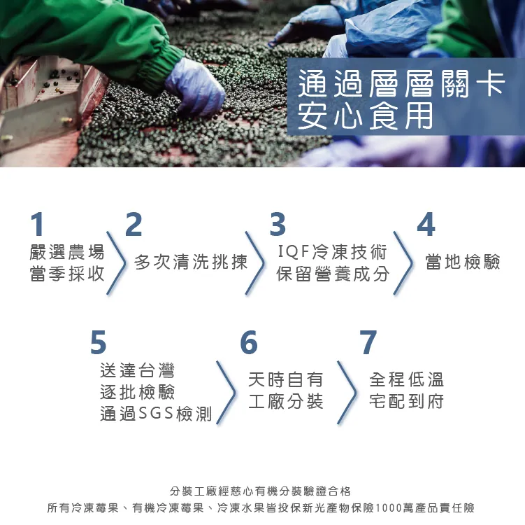 為了讓消費者在一年四季都能品嚐到當季採收的鮮美,天時莓果採用先進的 IQF 急速冷凍技術。在果實採收後經過多次挑選與清洗,隨即瞬間凍結,完整鎖住果實內的水溶性營養成分與水分。產品通過 SGS 檢驗合格,確認無農藥殘留。因為已經過嚴格處理,開封後無需再次清洗,只要放置常溫約 2~3 分鐘微解凍即可直接食用,既便利又安心,符合現代家庭對食品安全的高標準期待 。
