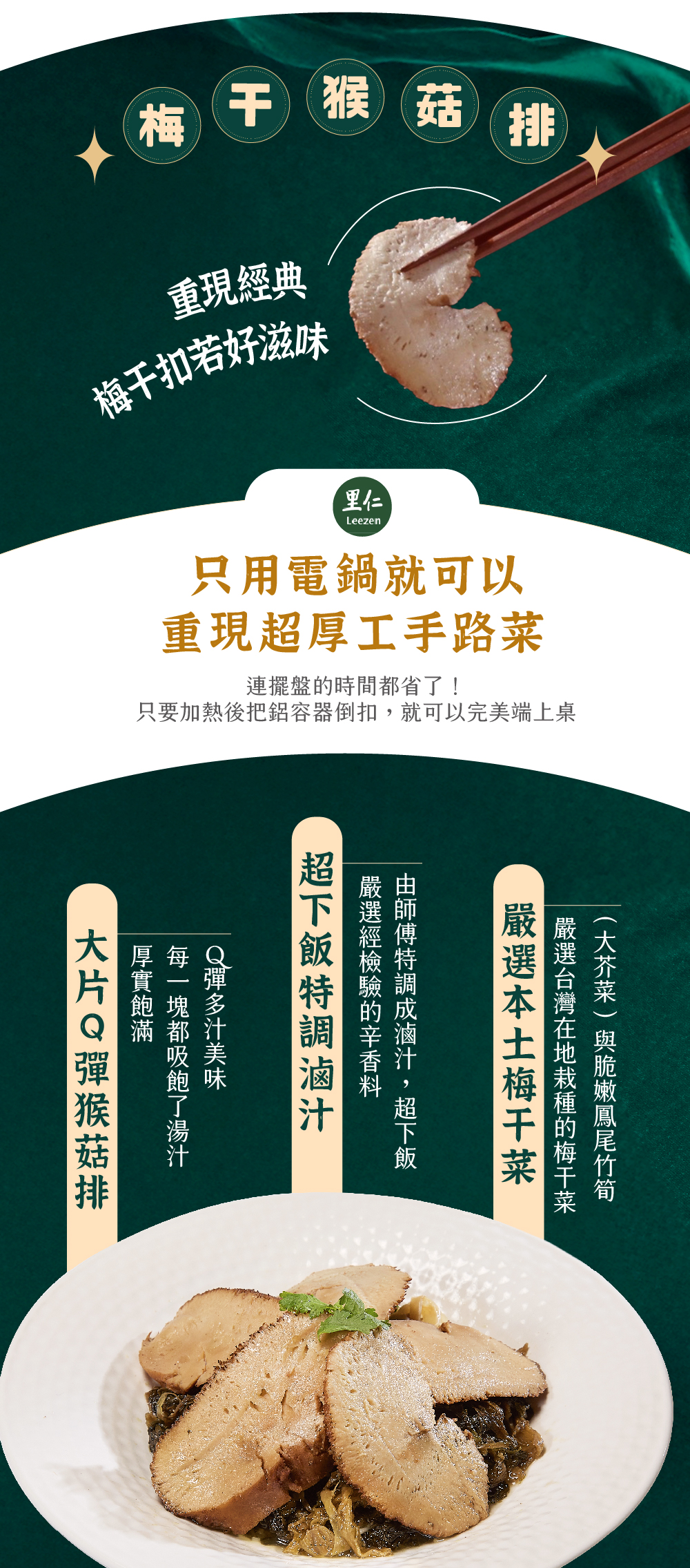 為了讓現代家庭也能輕鬆享用費工的功夫菜,梅干猴菇排採用冷凍保存技術。屬於奶素可食,無論是使用微波爐或電鍋蒸熱,簡單覆熱後即可上桌。濃郁的醬汁非常適合淋在白飯上,被譽為餐桌上的「白飯殺手」。無需長時間備料與燉煮,即可讓全家人享受到一道色香味俱全、充滿懷舊情感的客家手路菜。