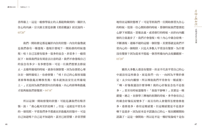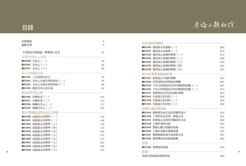 本書輯錄真如老師「廣論止觀初探」課程第0109至0153講,共45講開示,已將〈奢摩他〉章圓滿開示完畢。開示內容依序涵蓋:正明引生住心次第、由六力成彼之法、彼具四作意之理、顯示奢摩他成與未成之界限、有作意相及斷疑、總示依奢摩他趣道軌理、別顯往趣世間道軌、奢摩他結頌。