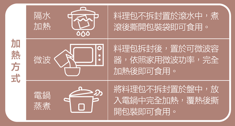 食/使用方式料理包無須額外加水,充分加熱後即可享用美味。
