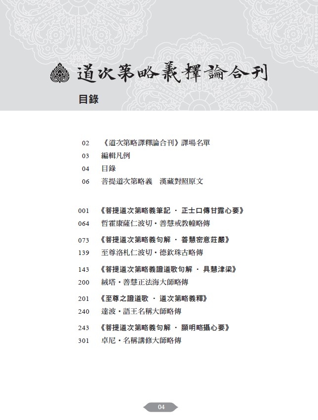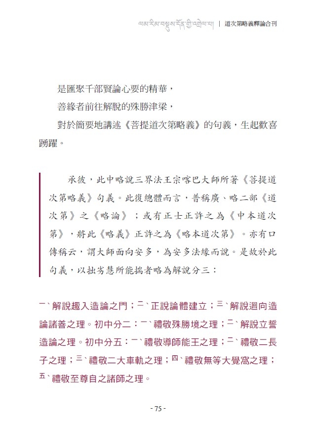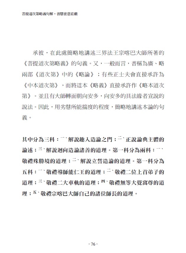 2.本書收錄古今共十位祖師大德對於宗喀巴大師所著之《菩提道次第略義》所造之註釋、科判,為學修道次第修心法類之重要參考著作。