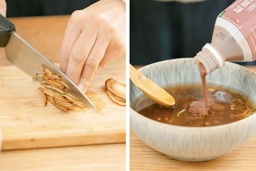 1. 將牛蒡原片沖泡熱水250cc至軟化。