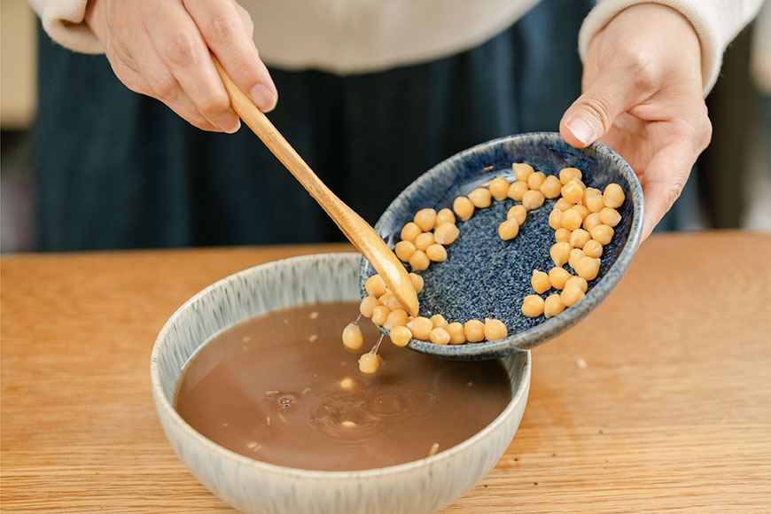 3. 準備一湯品容器,將紅豆紫米奶與紅豆湯混合,放入煮熟的鷹嘴豆、牛蒡碎片、紅棗與枸杞,即可享用。
