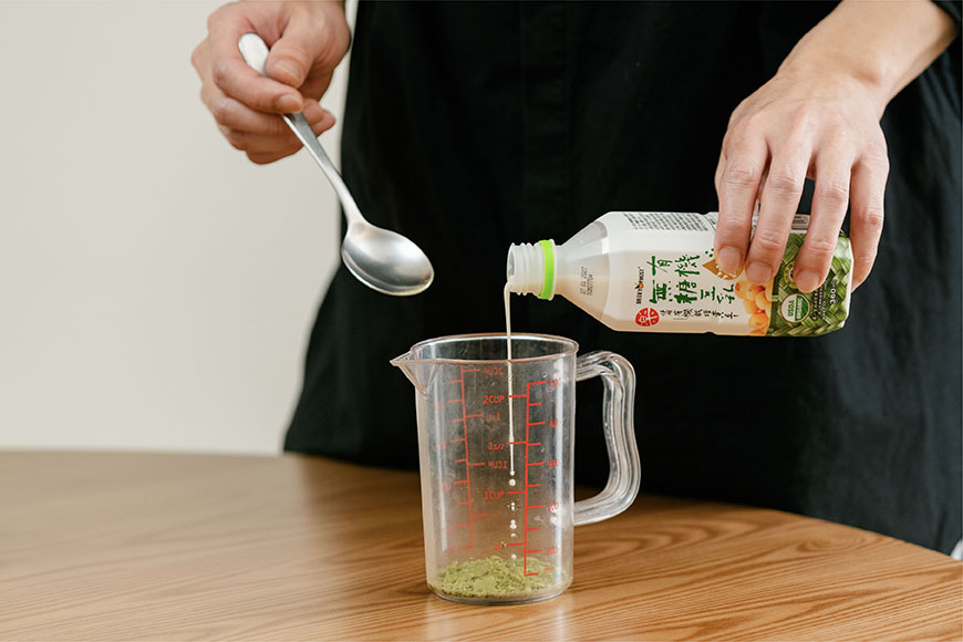- 抹茶粉「先稠後稀」更順滑:抹茶粉若直接加入大量液體容易結塊,先用少量豆奶拌成濃稠糊狀,徹底化開顆粒後再加液體,口感才會絲滑。