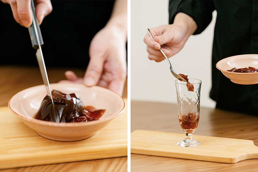 1. 將黑糖凍切成小丁狀後放入玻璃杯中,再加入冰塊。