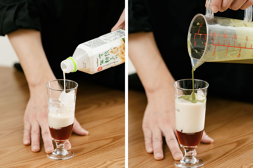 - 利用冰塊打造漸層感:倒入抹茶豆奶液時,對準冰塊緩緩流下,可以增加緩衝,讓抹茶綠與底部的黑糖凍層次分明。